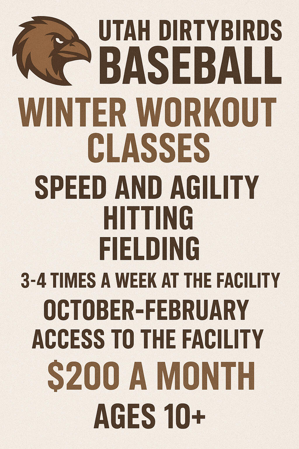 Join the Utah Dirtybirds Baseball Winter Workout Classes for athletes aged 10 and up. Focused on speed, agility, hitting, and fielding, these sessions are held 3-4 times a week from October to February. For $200 a month, gain access to our top-notch facility and improve your skills under expert coaching. Enhance your performance and stay competitive all winter long.SIGN UP DOWN BELOW